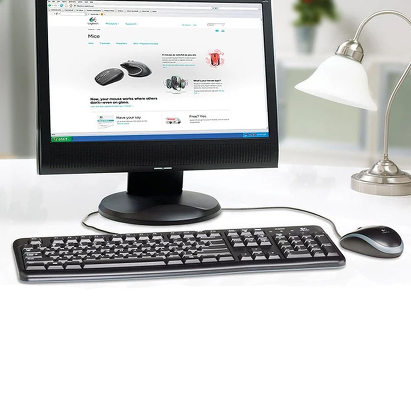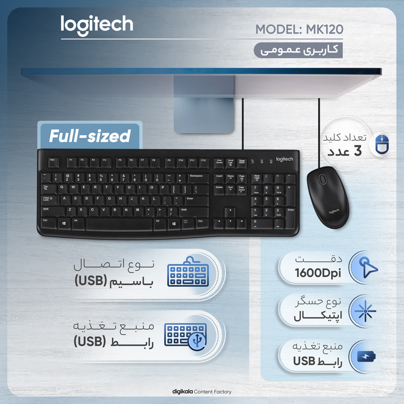 کیبورد و ماوس لاجیتک مدل MK120 یک مجموعه کاربردی برای استفاده‌های اداری و خانگی است که با طراحی ساده و ارگونومیک، راحتی و دوام را برای کاربران به ارمغان می‌آورد. کیبورد این مجموعه با ابعاد 23.5x155x450 میلی‌متر و وزن 550 گرم، به صورت سیمی و از طریق رابط USB به سیستم متصل می‌شود. فرم فاکتور فول‌سایز و وجود 103 کلید، همراه با 12 کلید میانبر، این کیبورد را به گزینه‌ای مناسب برای تایپ و انجام کارهای روزمره تبدیل کرده است. همچنین، حروف فارسی حک شده روی کلیدها، استفاده از آن را برای کاربران فارسی‌زبان ساده‌تر می‌کند. سوییچ‌های ممبران این کیبورد عملکردی نرم و بی‌صدا دارند و پایه‌های قابل تنظیم آن نیز امکان قرارگیری در زاویه‌ای مناسب برای راحتی بیشتر دست‌ها را فراهم می‌کند. ماوس این مجموعه نیز با ابعاد 38 × 62 × 113 میلی‌متر و وزن 90 گرم، طراحی راحت و جمع‌وجوری دارد. حسگر اپتیکال ماوس با دقت بین 800 تا 1600 DPI، امکان حرکت دقیق و روان را فراهم می‌کند که برای انجام کارهای روزمره و حتی بازی‌های سبک مناسب است. مجموعه کیبورد و ماوس MK120 لاجیتک با تمامی سیستم‌عامل‌های رایج، از جمله ویندوز و لینوکس، سازگار است و با دوام بالا و کارایی خوب، انتخابی اقتصادی برای کاربران خانگی و اداری به‌شمار می‌رود.